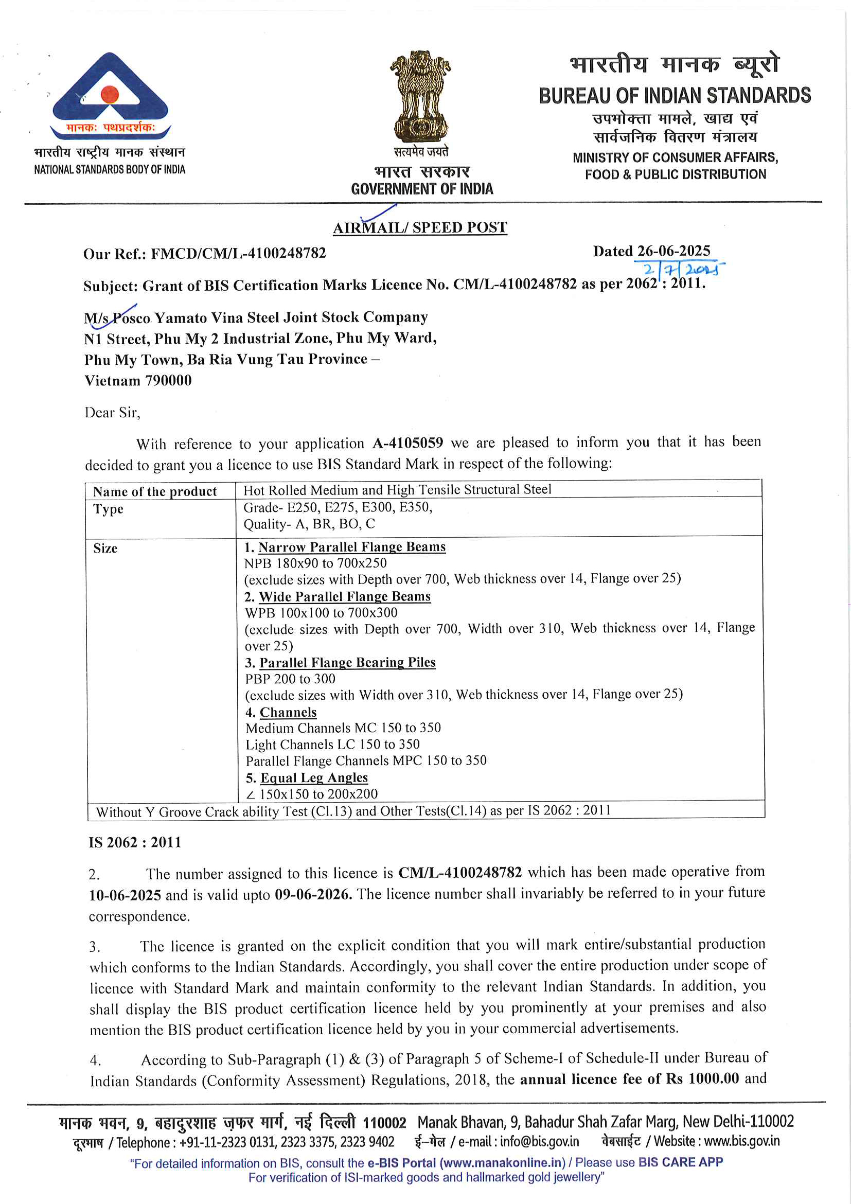POSCO YAMATO VINA STEEL JOINT STOCK COMPANY (PY VINA), the manufacturer of world best quality of hot-rolled structural steel and sheet pile, is a joint venture of POSCO (51% stake), Yamato Kogyo Co., Ltd.(30% Stake), and Siam Yamato Steel Co.,Ltd. (19% Stake). PY VINA is located in Phu My 2 Industrial Zone, Ba Ria Vung Tau with steel making capacity over 1.0 million metric ton per year.